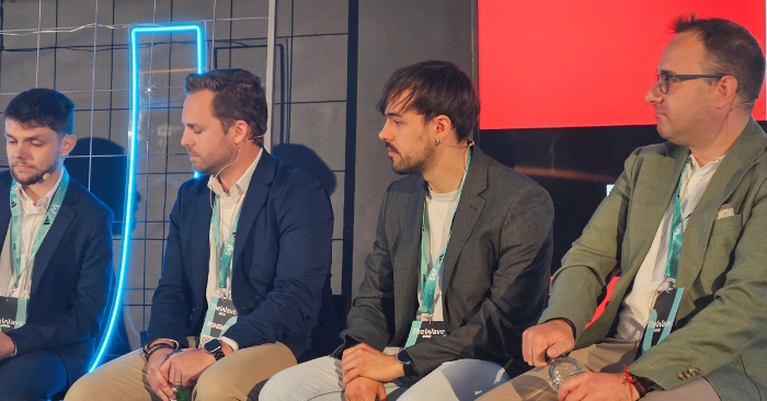 Source: Own image — Presentation of the BATeCHAIN project at The Wave 2026. Participants from left to right: Rubén Puértolas (Millor Battery), Álvaro Alcántara (Matrices Alcántara and AVIA), Juan Mercadal (NASIKA – Grupo Avanzare and AEI Rioja), and Mikel Llona (BIZIRPLASTIC and SERNAUTO).